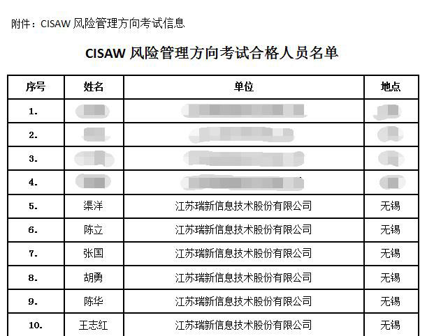 江蘇瑞新信息技術股份有限公司專注于開拓業務范圍的同時,也十分重視公司員工的素質的提升和進步,公司大力支持員工參加專業資格認證以更好地為客戶服務。通過多年的工作經驗積累和系統化的集中學習,在2018年5月11號風險管理方向專業級考試的的6位員工全部通過考試,其中三人通過專業級認證。